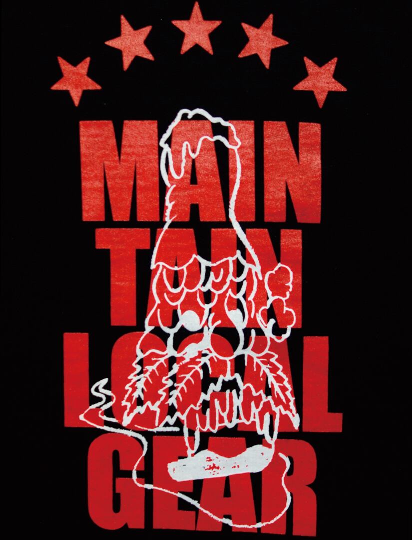 温かみのあるクレヨンで描かれた 意味深なキャラクターを胸にあしらった1着。