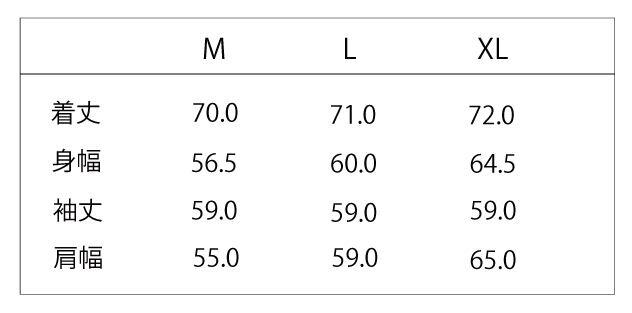M 着丈 70.0 身幅 56.5 袖丈 59.0 肩幅 55.5